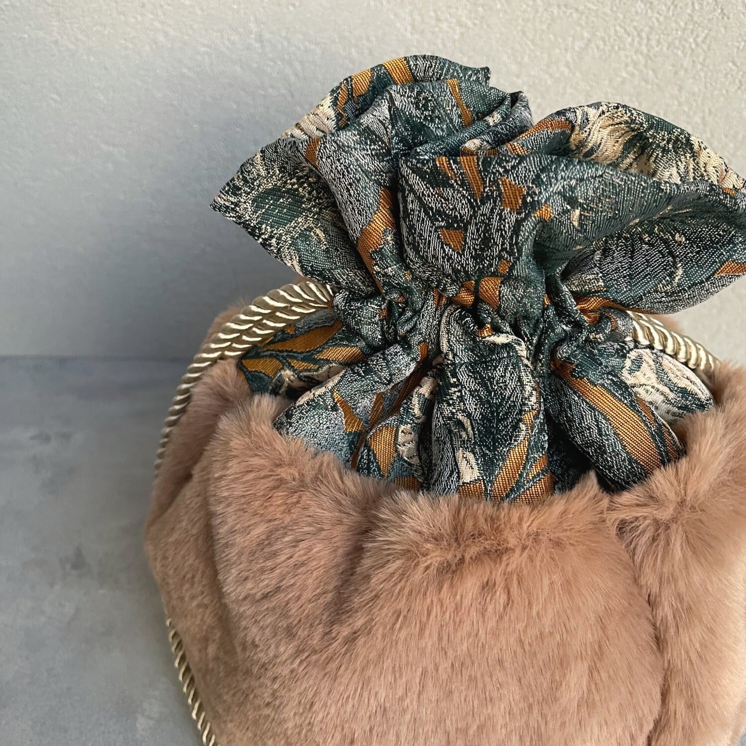 柄生地とファー生地を切り替えた大人な巾着バッグ。